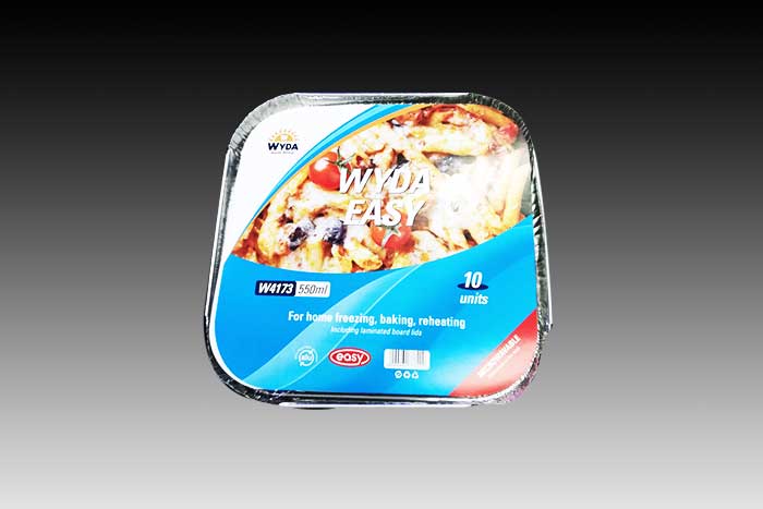 Retail Pack of the single portion square sized aluminium foil container with 550ml capacity. 10 units packed per pack including laminated board lids. It has an interrupted vertical curl rim to keep the lid on.